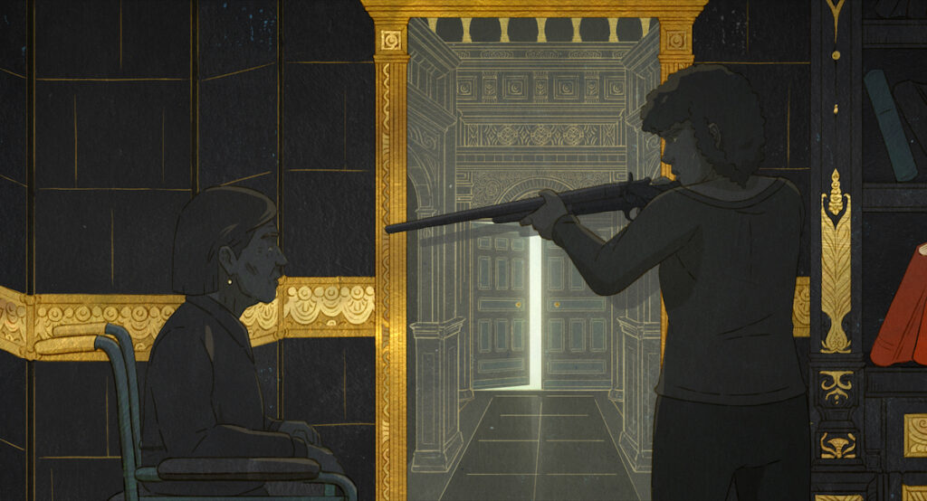 L’animation est un artifice que j’aime assumer. Elle engage le spectateur d’une manière différente, car il sait que ce qu’il voit n’est pas la réalité. Cela lui permet une certaine distance et une réflexion. Je voulais que les personnages se fondent dans le décor, qu’ils ne soient pas toujours détachés. C’est un principe de mise en scène qui permet de montrer que les personnages et leur contexte sont graphiquement liés, comme Hélène et la vieille dame, qui partagent les mêmes yeux. J’ai conçu le film comme une séquence de couleurs. J’ai réduit la palette pour un souci de clarté, mais aussi pour faire résonner la radicalité des convictions des personnages. L’abstraction révèle et efface à la fois. Elle révèle la matière, l’immédiateté, mais efface aussi les nuances et la complexité visuelle. L’animation m’a également permis d’utiliser des animaux symboliques. La violence aurait été grotesque avec des êtres humains, mais avec une brebis ou un loup, elle prend un autre sens. L’idée de proie et de prédateur dont les rôles s’inversent était très intéressante à mettre en scène. On retrouve également un colibri qui symbolise la fragilité et la beauté de la vie, tandis qu’un passereau représente l’espoir d’un retour à la vie, la possibilité de remettre du mouvement. À eux deux ils incarnent un sacrifice brutal pour un résultat concret.